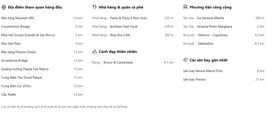 Nằm cách Sân bay Venice Marco Polo 10 km, khách sạn gần các điểm tham quan như Bảo tàng M9 (16 phút đi bộ) và Ga tàu Venezia Santa Lucia (9 km). Các phương tiện giao thông công cộng được du khách đánh giá cao.
