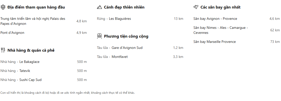 Sân bay Avignon - Caumont cách chỗ nghỉ 5 km trong khi Ga tàu TGV Avignon cách đó 20 phút lái xe.