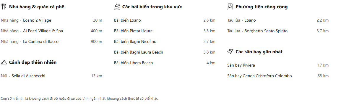 Khu nghỉ dưỡng cung cấp dịch vụ đưa đón miễn phí đến trung tâm Loano. Nơi đây cũng có gara và có thể dễ dàng đến được từ xa lộ A10 Autostrada dei Fiori, cách đó 3 km.