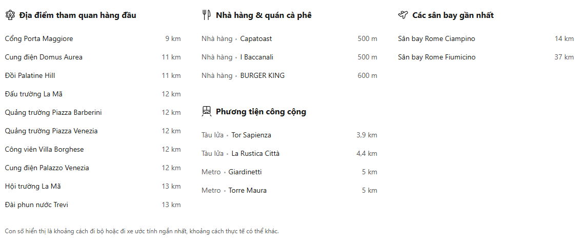Cách trung tâm thành phố Rome 20 phút lái xe, cách sân bay Roma Fiumicino 30 phút lái xe, trong khi Trung tâm mua sắm Roma Est cách đó 10 phút lái xe.